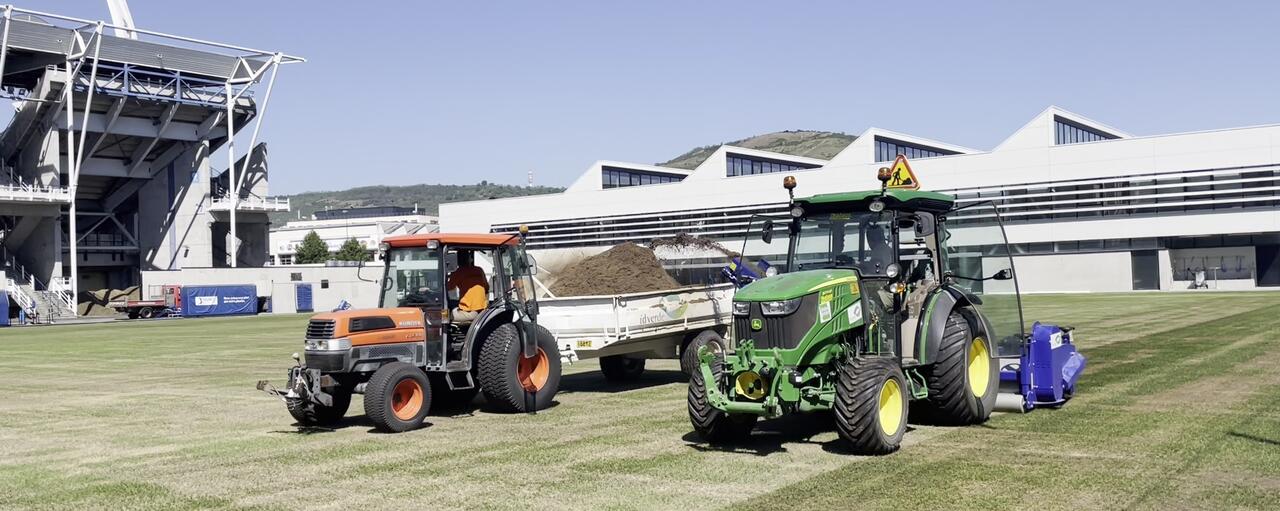 L'entreprise préconise une surface de 50 à 100 m2 par but. Les travaux sont généralement réalisés à l’intersaison d’été, pour une reprise des matchs et/ou des entrainements de 55 à 100 jours après la pose (selon l’entretien réalisé)." Pour le mettre en place, on procède à un décapage d'environ 5 cm du gazon puis on injecte du sable amendé avec de la matière organique dans une chape avec un rétenteur d'eau. Ensuite, on met le tapis synthétique que l'on va remplir d'un mélange de sable et de matières organiques sur 3 des 5 cm du tapis de fibres synthétiques. On sème ensuite du Ray grass anglais de type Homogénius. C'est un travail très fin et très minutieux pour que le raccord entre le naturel et l'artificiel se fasse correctement ", insiste l'expert en pelouses sportives de Green Style.