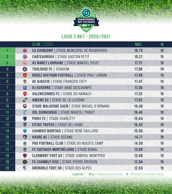 La Berrichonne de Châteauroux (18.21) et l’AS Nancy Lorraine (17,72) terminent respectivement deuxième et troisième. Au niveau de la fin du classement, nous retrouvons les trois même équipes. Le Clermont Foot (13.08), Chambly (12.94) et Grenoble (12.93).