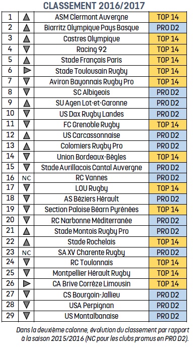 Le podium est complété par le Castres Olympique, qui gagne 11 places par rapport à l'an dernier.