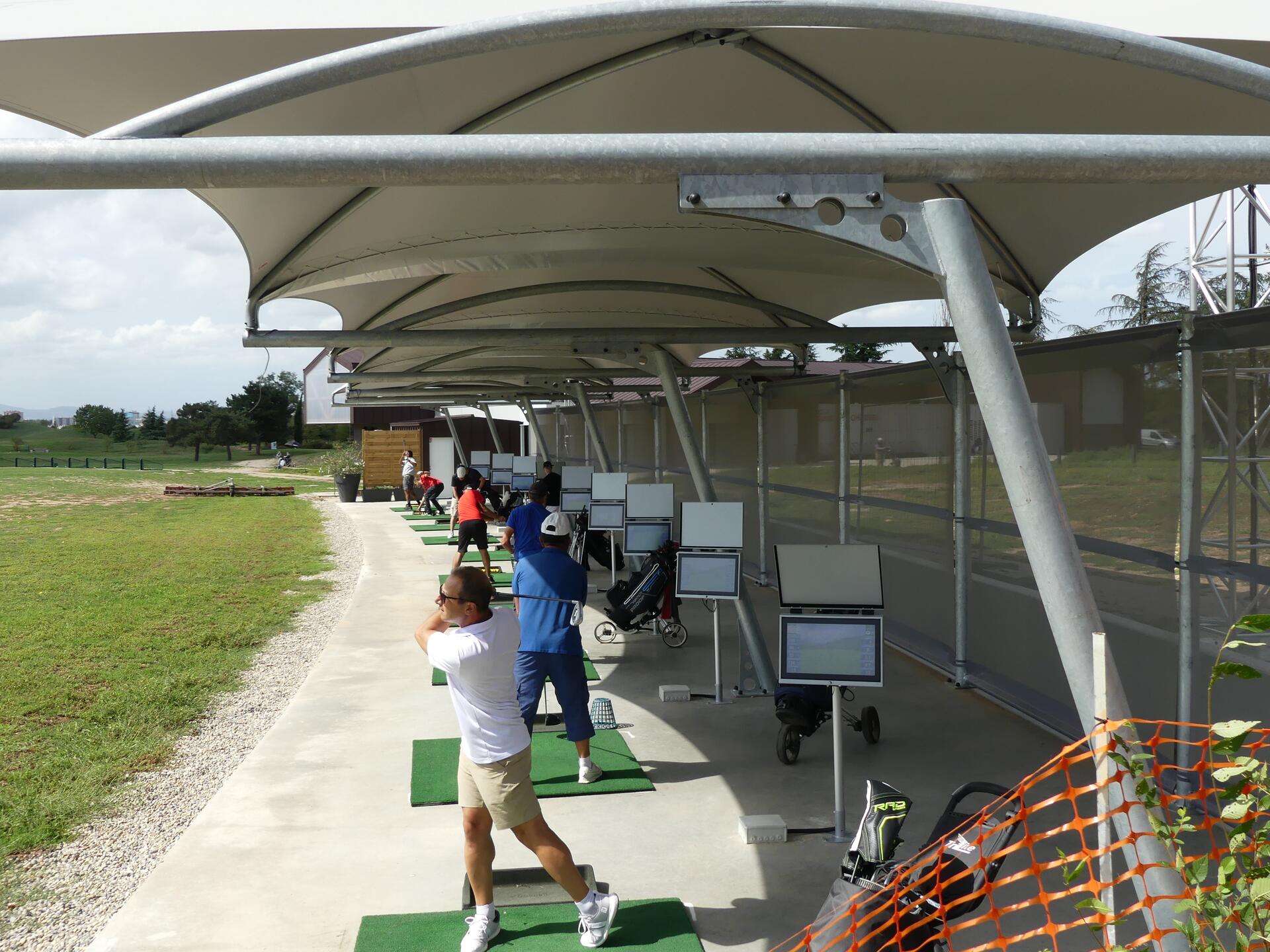 Les travaux d’installations se sont achevés fin juillet et les 10 postes de practice connecté ont ouvert dans la foulée. Dix autres seront bientôt installés. Après la réalisation de la dalle béton, il a fallu décaisser le sol, déplacer une canalisation d’arrosage et implanter l’abri Carapax. Un local pour la machine à balles a été créé. Enfin, l’équipe britannique de Toptracer est venue installer et paramétrer le système (écrans, caméras).