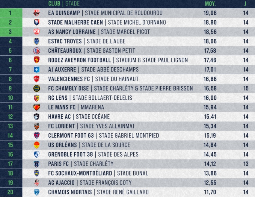 Et ce sont donc respectivement le Paris-Saint-Germain (avec une moyenne de 19,43) et l'En Avant Guingamp (moyenne : 19,06), qui remportent les classements de L1 et L2.