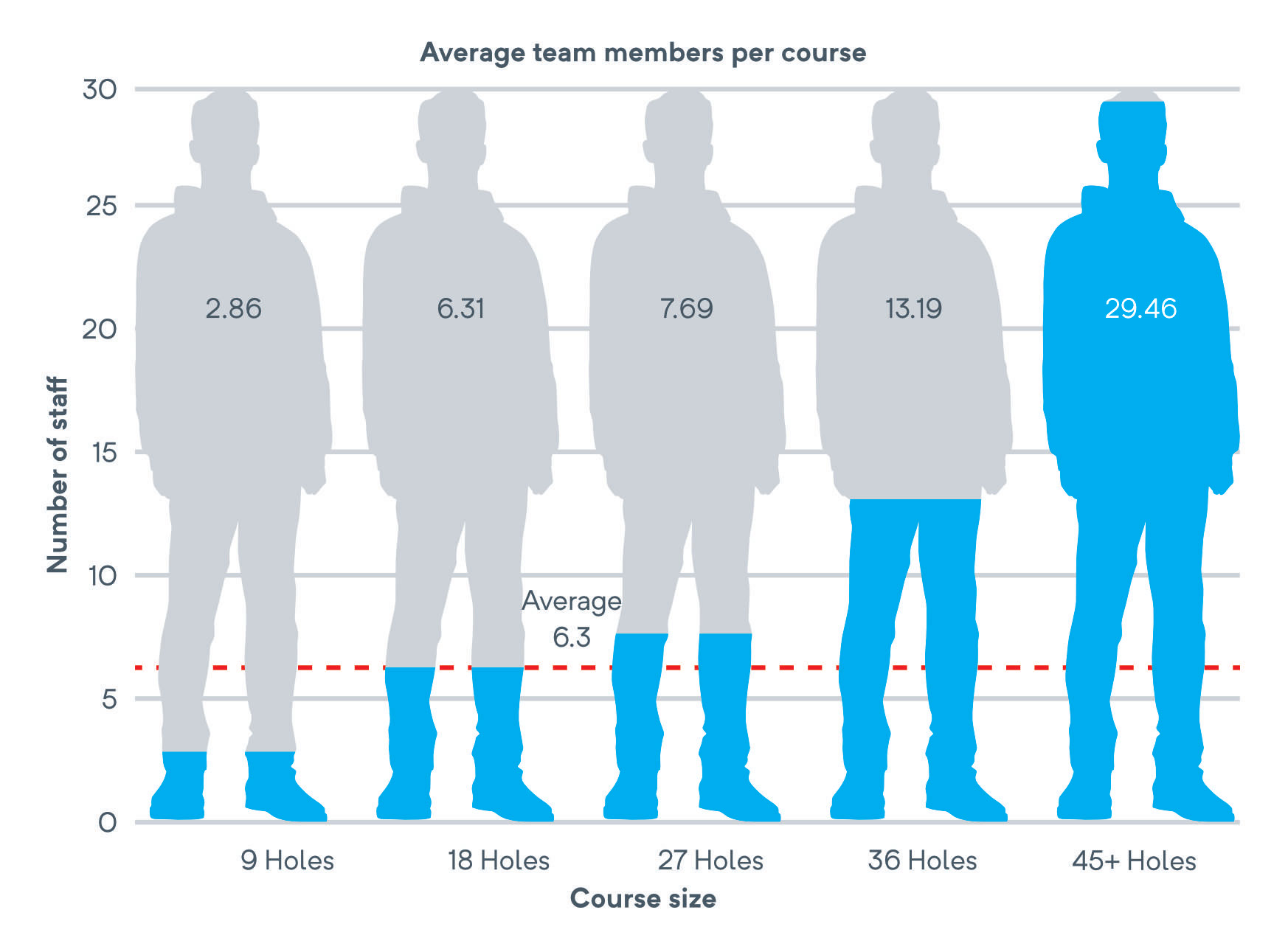 En 2019, un parcours de golf de 18 trous comptait en moyenne 5,5 greenkeepers à temps plein et un greenkeeper saisonnier. En 2022, ce nombre est passé à 6,3 avec 1,6 greenkeeper saisonnier. Cette augmentation générale des effectifs peut s’expliquer par le boom de la pratique qui a suivi les fermetures liées au coronavirus au cours des deux dernières années.