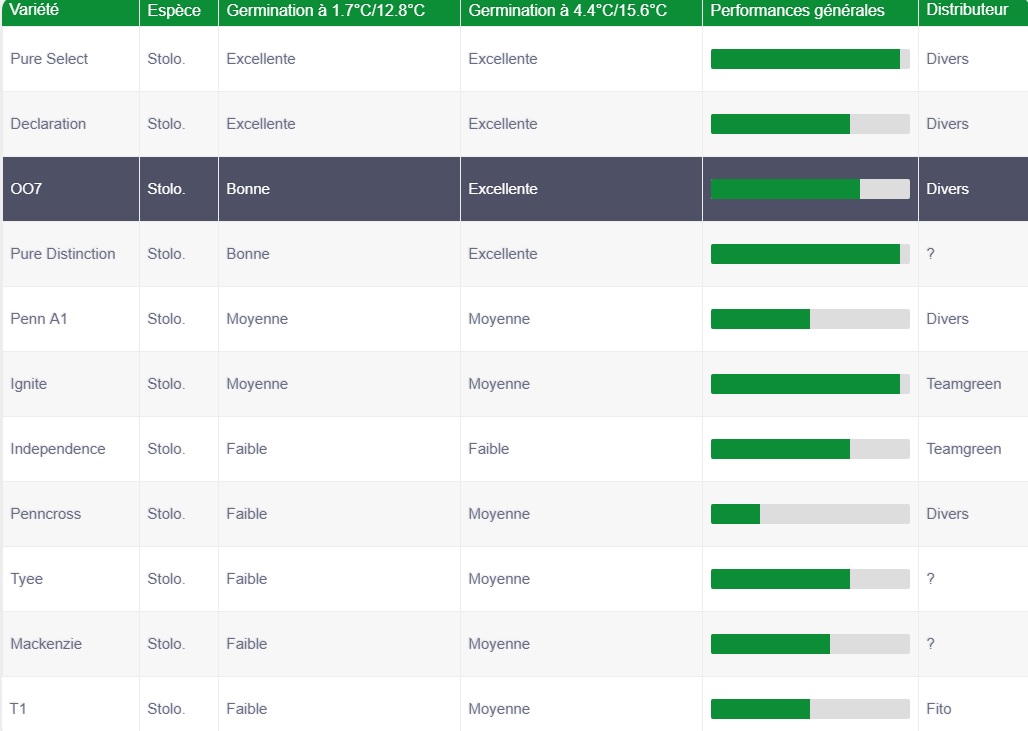 "Les variétés Proclamatation, Declaration et Pure Select possèdent les capacités de germination à basse température les plus élevées pour ce couple de température (...). Elles représentent ainsi un excellent choix pour le greenkeeper lors des regarnissages des aérations de printemps. Les variétés Memorial et Independence possèdent quant à elles une faible capacité de germination pour ce couple de températures. Elles sont donc à éviter lors de la première aération de l’année."