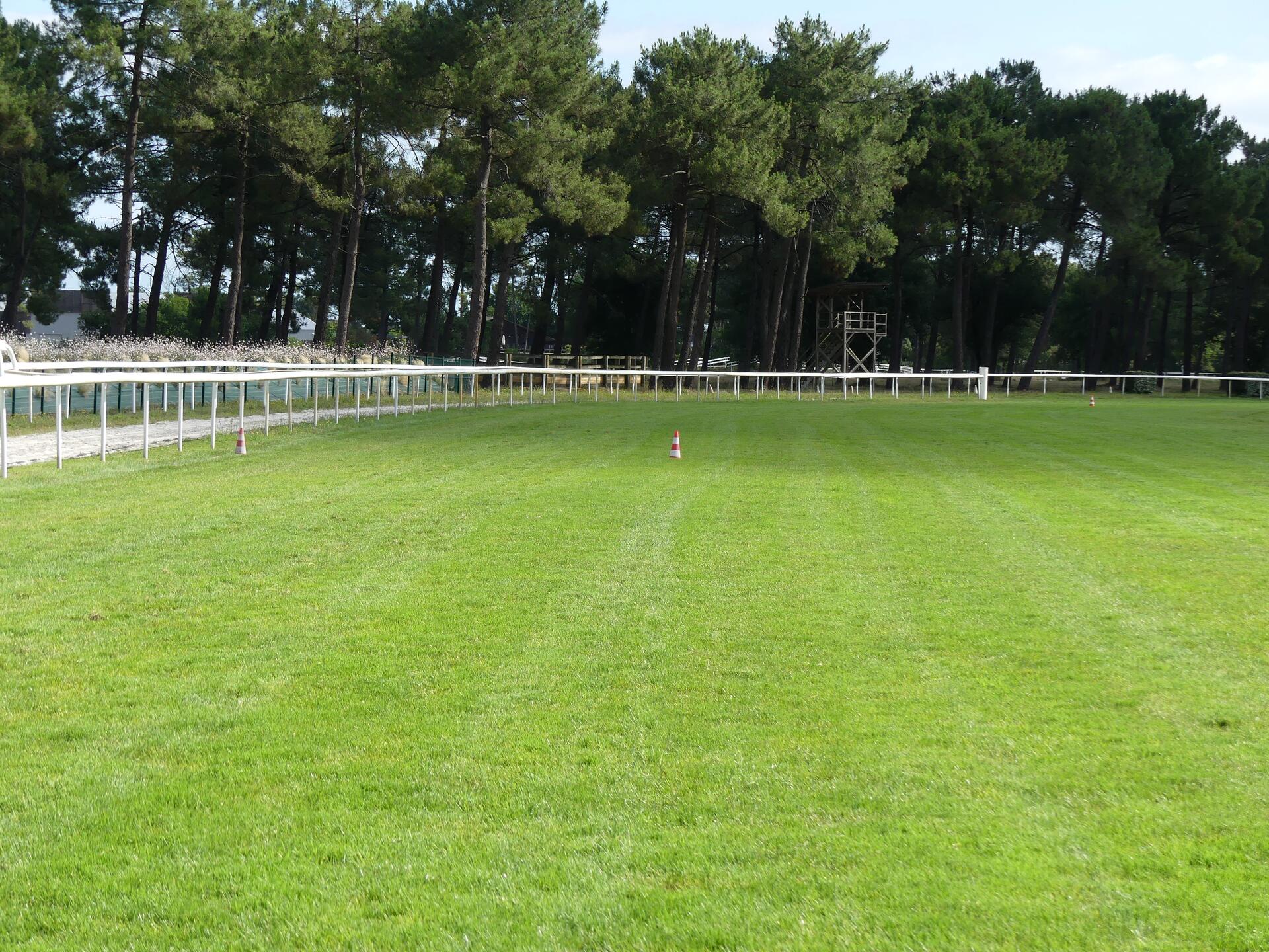 S’en suivent des apports en matières organiques avec de la chaux et des produits Frayssinet, et un regarnissage de la piste. Le mélange n’est pas homogène sur l’intégralité de la piste. La corde, plus sollicitée par les chevaux, est regarnie avec un mélange 80 % Ray-grass et 20 % fétuques élevées afin d’avoir une pelouse résistante à la chaleur. Le reste de la piste est regarni en 3 Ray-grass.