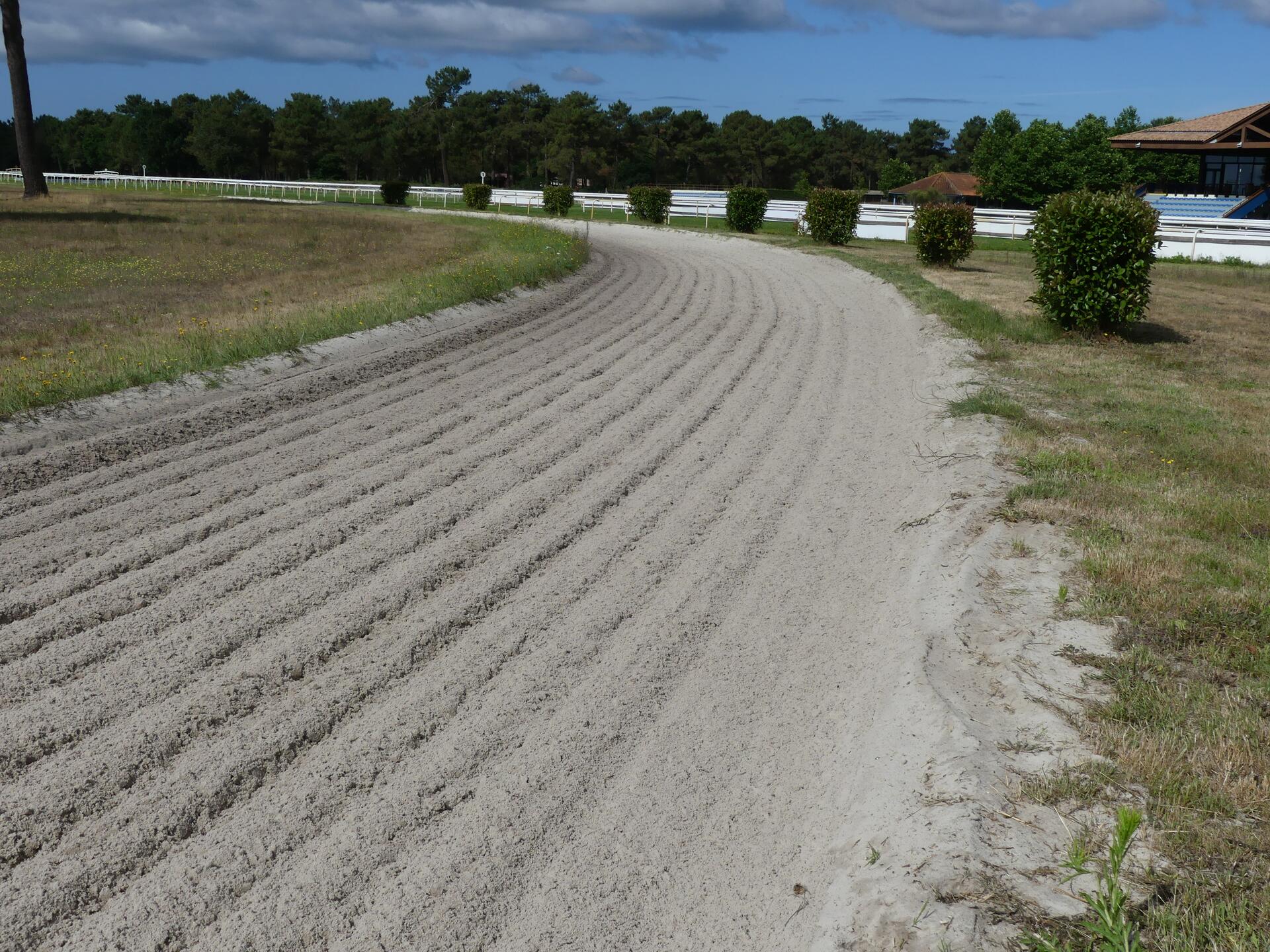 En cette matinée de milieu de semaine, nous sommes surpris de rencontrer autant de chevaux sur le site. « On est hippodrome mais aussi centre d’entraînement », nous explique-t-il. « Il y a à peu près 400 chevaux à l’année et 200 personnes qui y travaillent, dont 22 entraîneurs. » Si les écuries, louées par la Société des courses de la Teste propriétaire des lieux, ne font pas partie du périmètre de Lionel Jouan, la présence du centre d’entraînement génère un surcroit de travail non-négligeable au niveau des pistes : les pistes d’entraînement en sable sont hersées toutes les demi-heures et arrosées quotidiennement, la niveleuse est passée tous les dix jours pour assurer leur planimétrie.